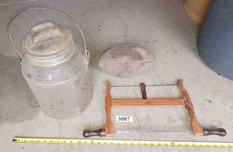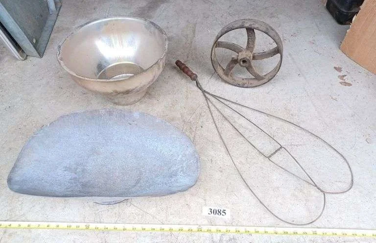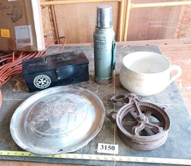 3150 DeSoto hubcap, Stanley thermos, Canadian Pacific first aid kit, chamber pot, antique pulley
