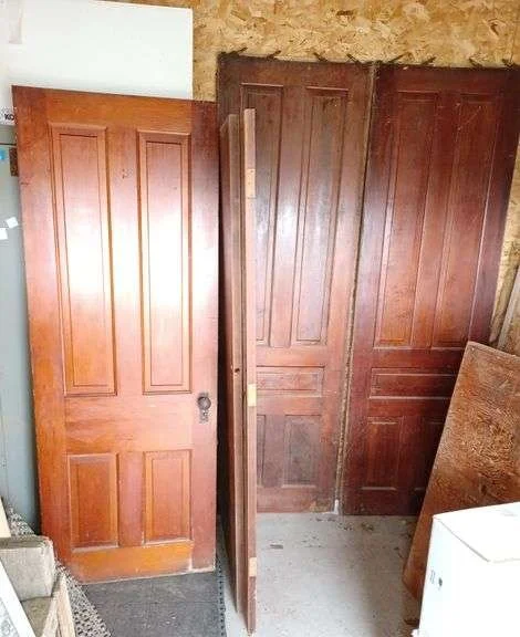 3076 Pair of Victorian 5 panel pocket doors with original hardware, four panel door with Victorian hardware, two Hollow core interior doors