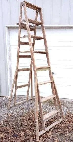 3011 8 ft wood step ladder with wide base legs, platform steps on top three steps