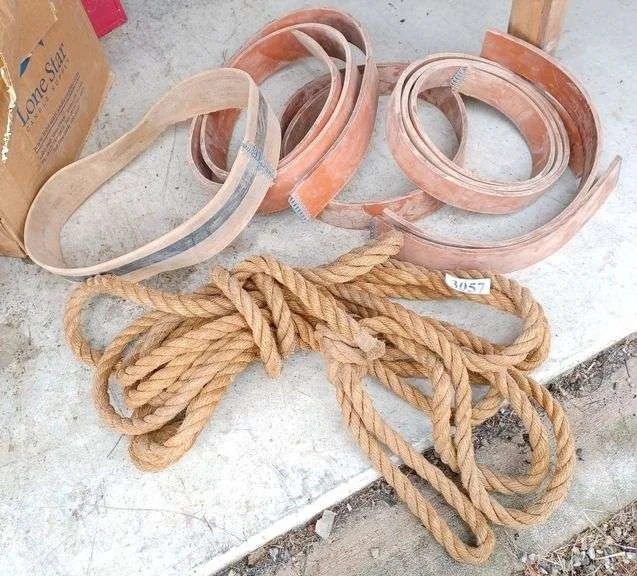 3129 Several lengths of rope, belts, electrical cable, etc.
