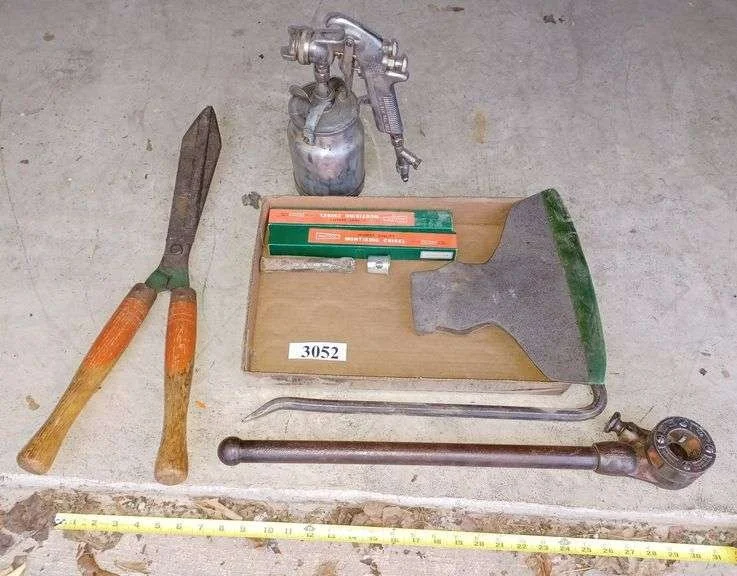 3052 Large axe head, rigid pipe threader, pry bar, two mortising chisels, paint sprayer, hedge trimmer