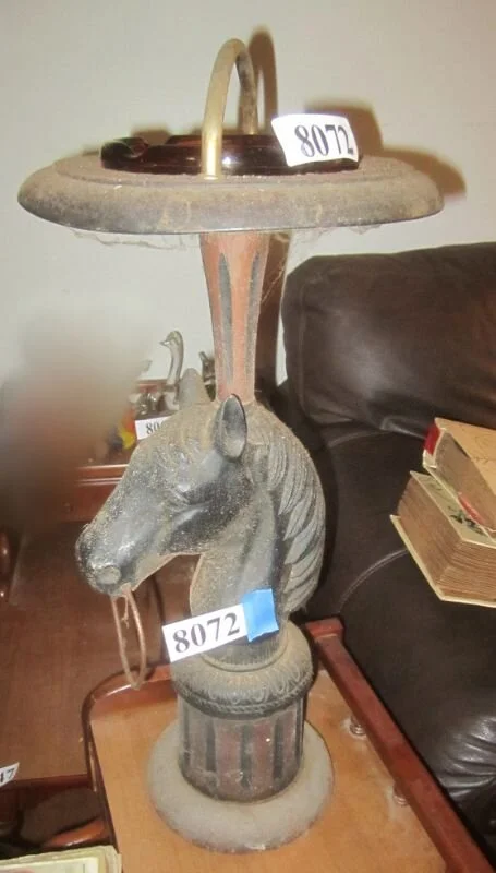 8072. Vintage metal horse-head smoking stand, could definitely use a good cleaning. Location: Living room