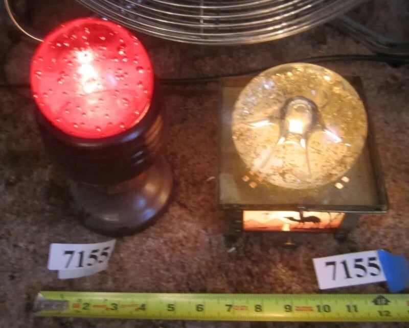 7555. 2 vintage Coleman lanterns, 2 vintage lunchboxes, electric squirrel cage fan. Location: Basement front room