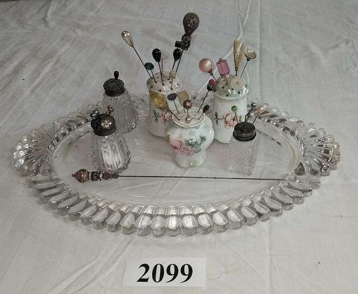 2063 Pattern glass butter dishes, toothpicks, vases