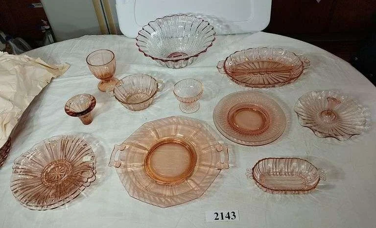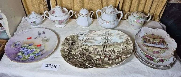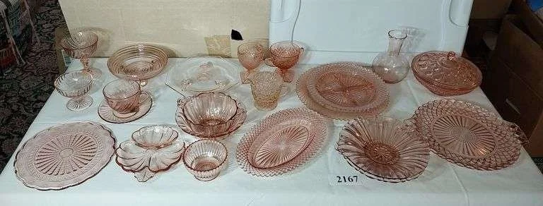 2648 Pink depression plate, cups and saucers, Johnson Bros coaching scenes platter, Etc
