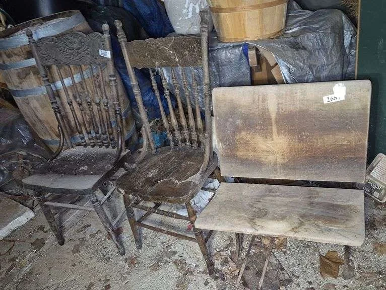 2687 Vintage school desk bench, two different antique pressed back chairs