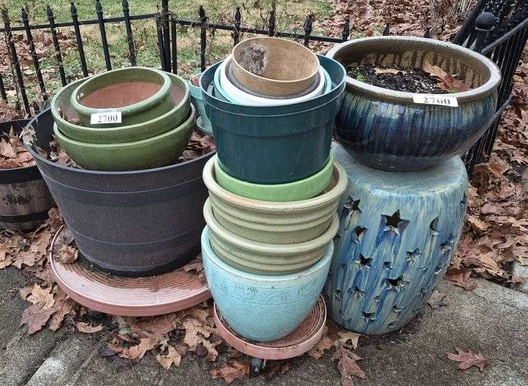 2700 Ceramic and plastic planters, ceramic garden seat, Etc