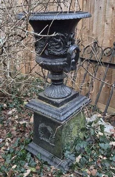 5317 Three cast metal urns / planters with pedestals