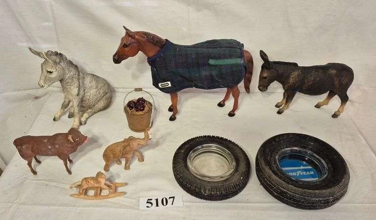 5050 Wood carved deer, celluloid moose, toy horse mold, advertising pin tray, train pass from 1927, Etc