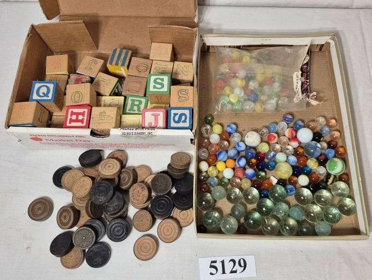 5034 Miniature puppet show, vintage caps in boxes, wood checkers, vintage Jacks and balls