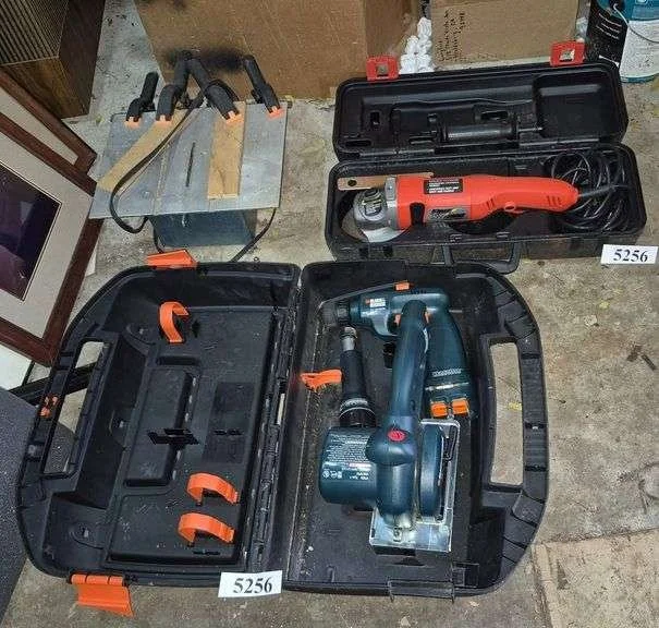 5256 Black and Decker angle grinder in case, versapack tool set in case, small table saw