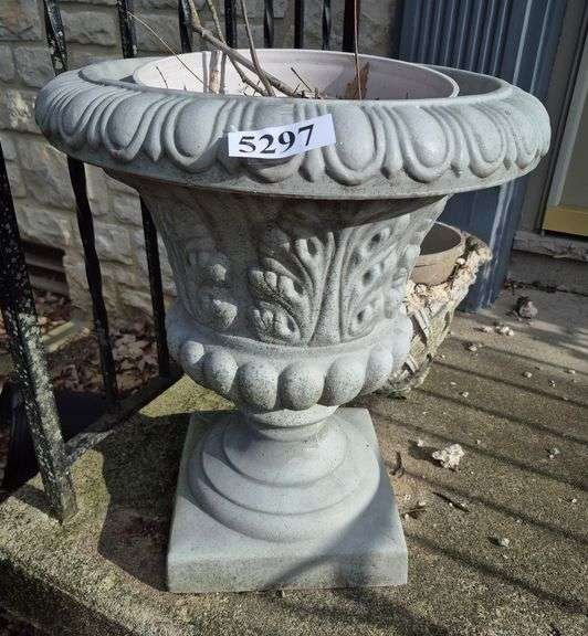 5297 Two tall plastic decorative planters, cleaning rights to various other planters and garden decor in