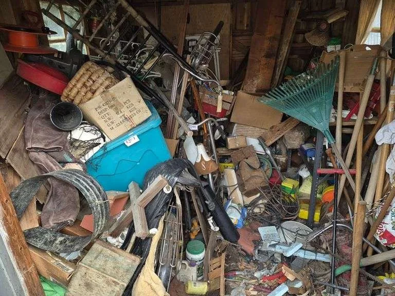 5299 Two vintage bicycles, at least 3 Little red wagons, Yard tools, Christmas decorations, Plantersn Gar