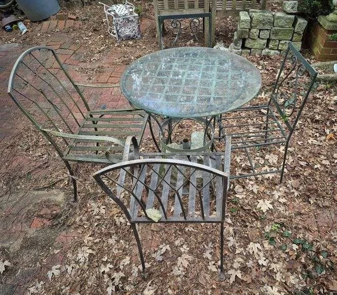 5301 Small Metal Patio table with glass top, Two pairs of metal Patio chairs