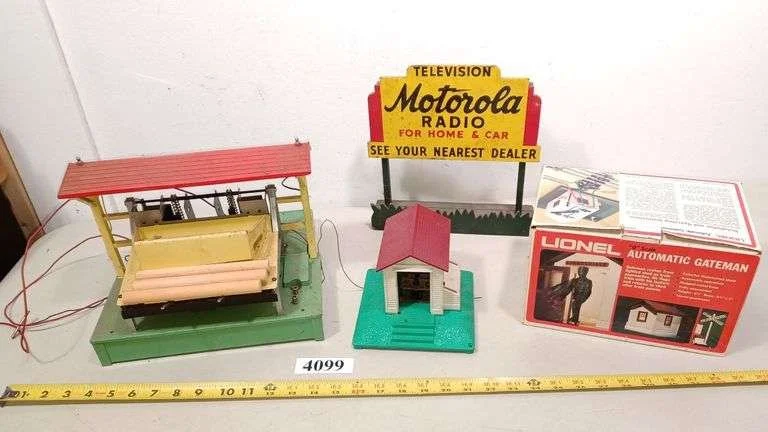 4099 Lionel 164 lumber shed, automatic gateman in box, etc. , hand made Motorola billboard