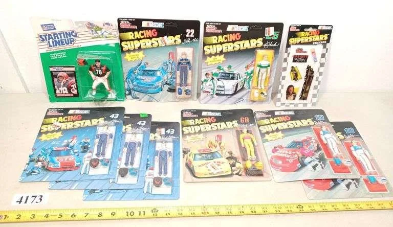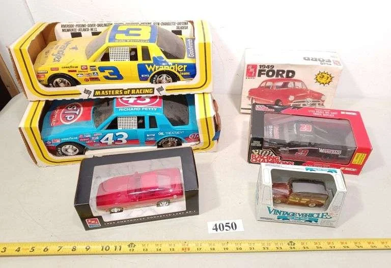 4050 Large NASCAR plastic cars in box, 1949 Ford Model sealed in box, diecast and plastic cars