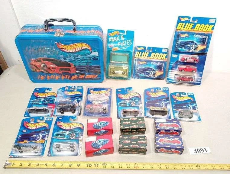 4091 HotWheels diecast cars and trucks in packaging, HotWheels metal case