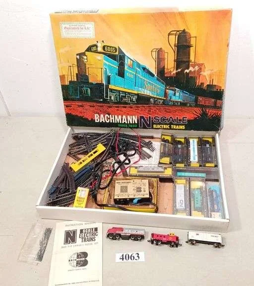 4063 Bachmann N scale locomotives, cars, transformer, track, Etc in box