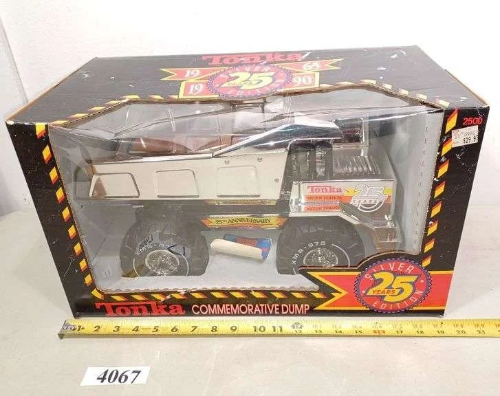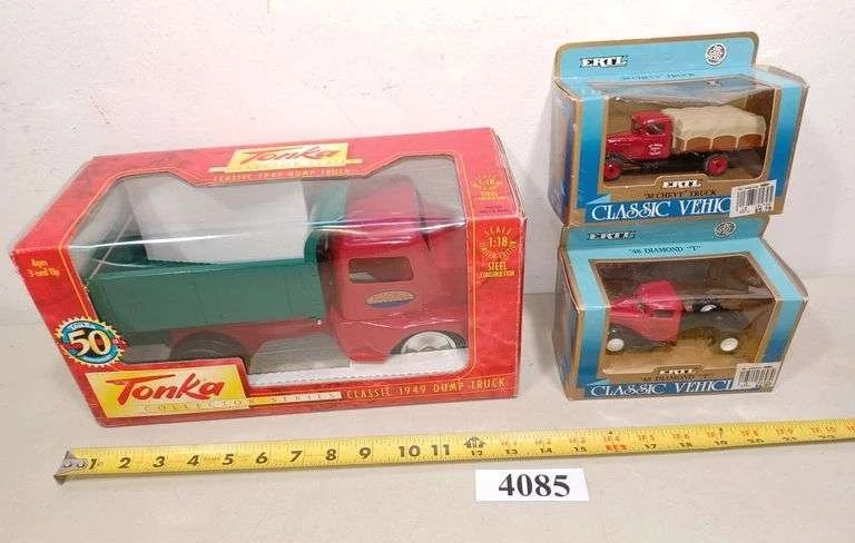 4085 Tonka reproduction 1949 dump truck in box, (2) ERTL diecast reproduction trucks in boxes