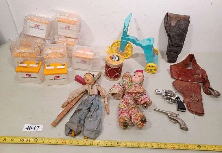 4047 Cap and toy guns, General Battery Corp banks, marionette, drum, Etc