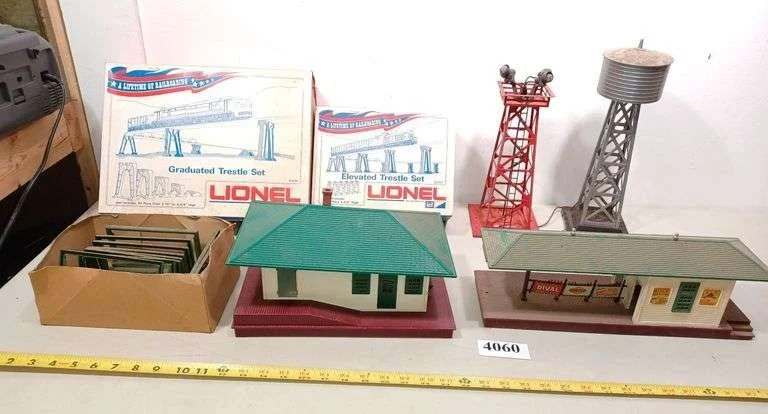 4060 Lionel plastic buildings, billboard frames, Trestle sets, metal floodlight Tower, Marx plastic water tower
