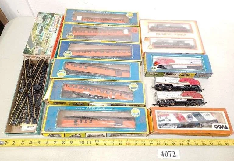 4072 HO gauge locomotives, Milwaukee Road train car set, track and plasticville building