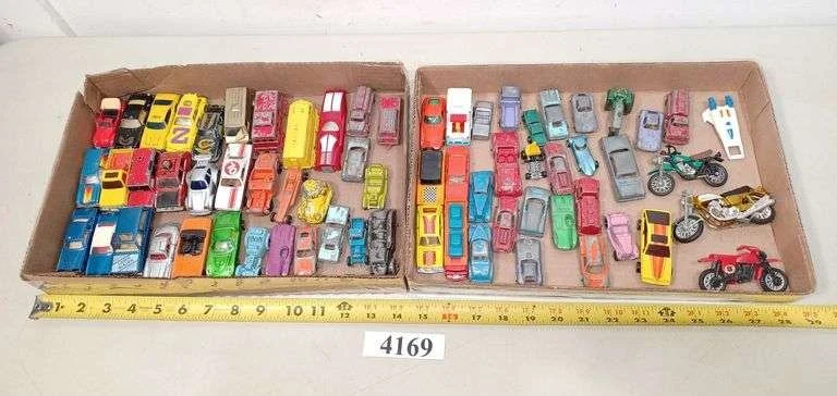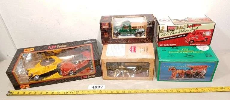4097 Diecast cars, trucks, horse and carriage in boxes
