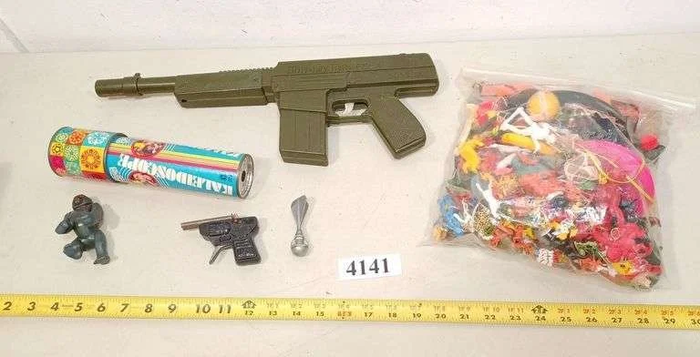 4141 Johnny Tar Heel noise making toy gun, cardboard kaleidoscope, plastic animals and army men, Etc
