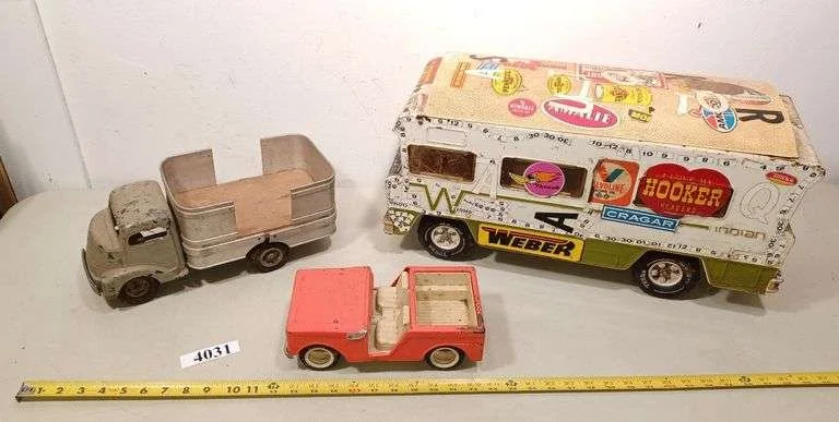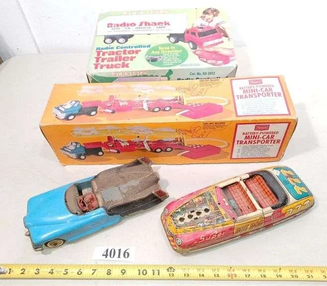 4016 Vintage remote control tractor trailer, battery op car transport, 2 vintage toy cars