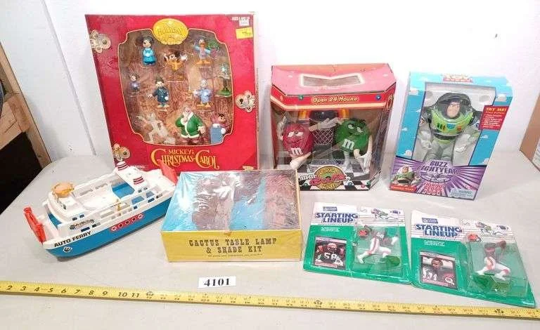 4101 Buzz Lightyear talking action figure, M&Ms figurine, Disney Christmas figurines, starting lineup figures, ferry boat, Etc