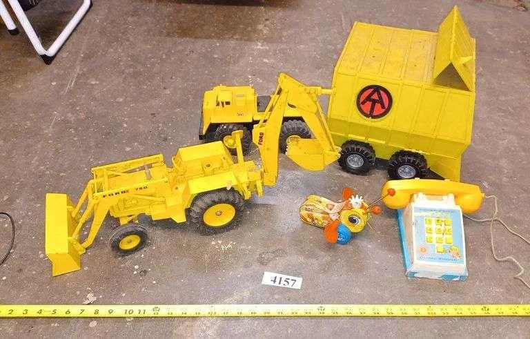 4157 Ford loader ( missing seat ), Fisher Price phone and busy bee, other toys.