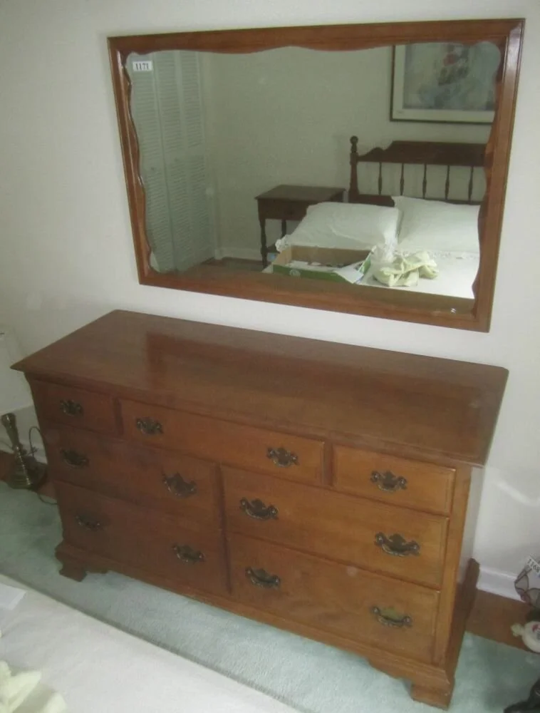 1171. Ethan Allen maple bedroom set including dresser with wall-hanging mirror, chest of drawers, headboard, and night stand. Very minor finish wear on dresser at base and around one pull. Dresser is 33" tall,54" wide, 19 1/2" deep. Chest is 47" tall, 35" wide, 19" deep. Night stand is 26" tall, 22" wide, 18" deep. Location: Bedroom 1