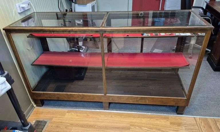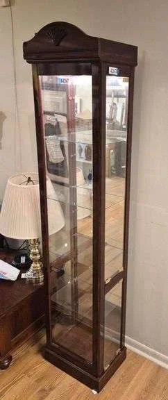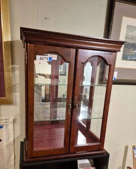 4079 Small lighted mirror back two door display cabinet with glass shelves