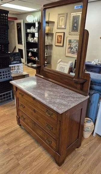 4085 Victorian 3 drawer dresser with pink Granite top and mirror with candle stands