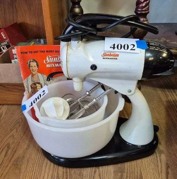 4002 Vintage Sunbeam Mixmaster Stand Mixer with milk glass bowls