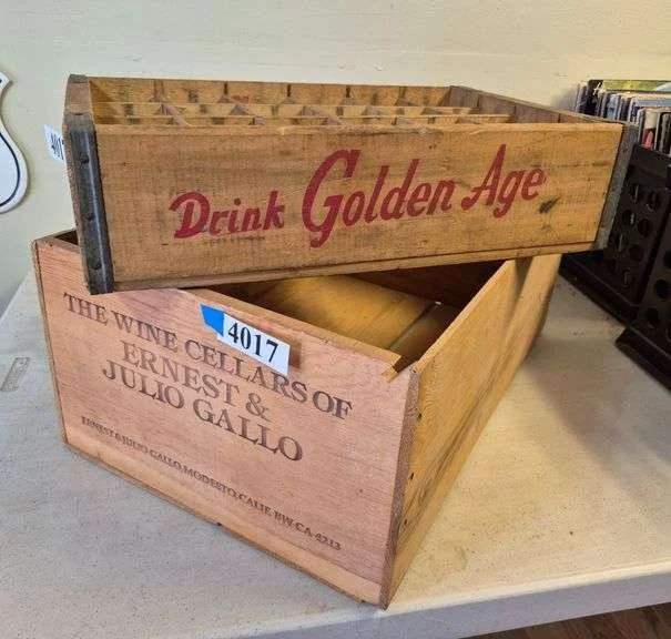 4017 Golden age soda bottle crate, Gallo wine crate