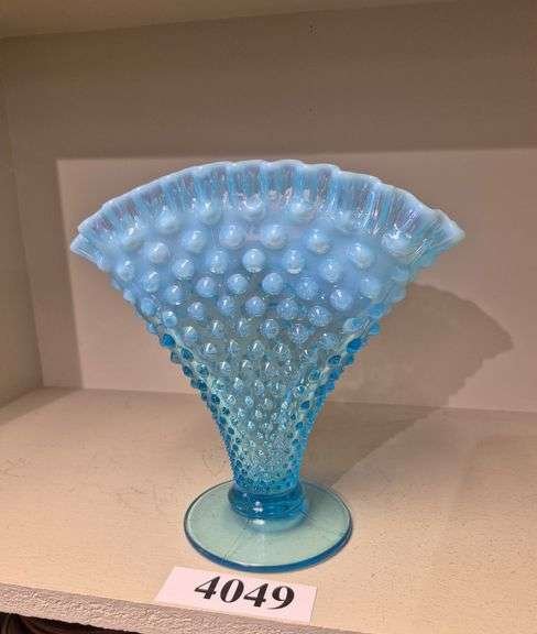4049 Fenton blue hobnail fan vase with opalescent ruffled Edge