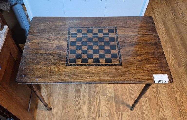 4056 Antique folding sewing table with game board painted on it