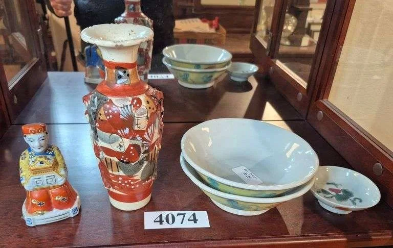 4074 Asian vase, incense burner, bowls