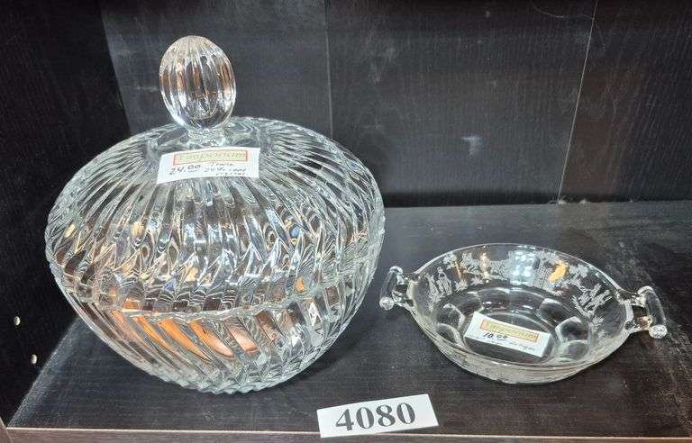 4081 Towle lead crystal covered dish, small antique etched glass double handled bowl