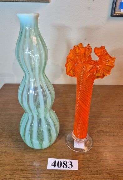4083 Green Fenton vase, Orange Swirl hand blown vase