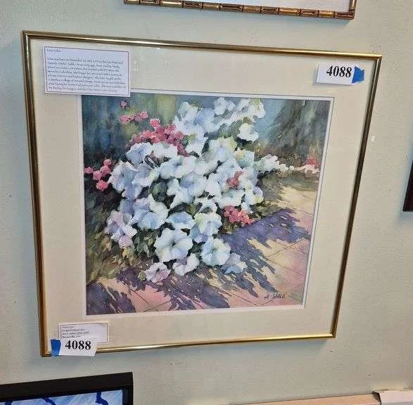 4088 Framed artist signed "Petunias" watercolor painting