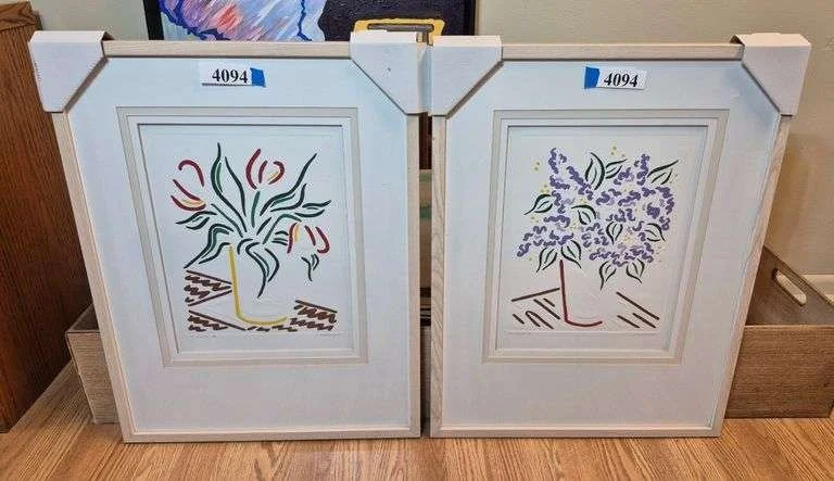 4094 Pair of framed artist signed embossed paper flower paintings