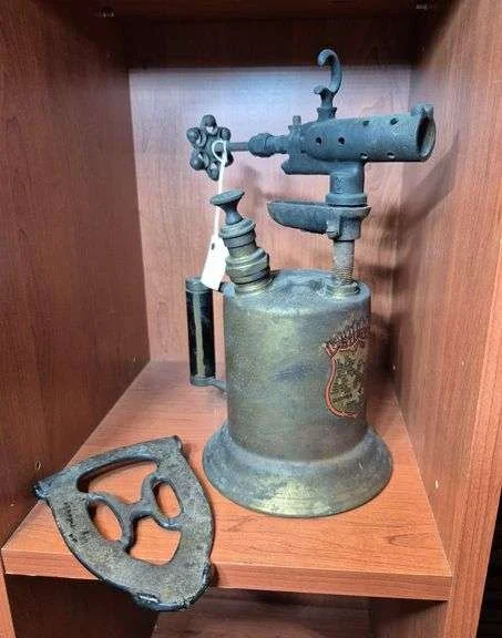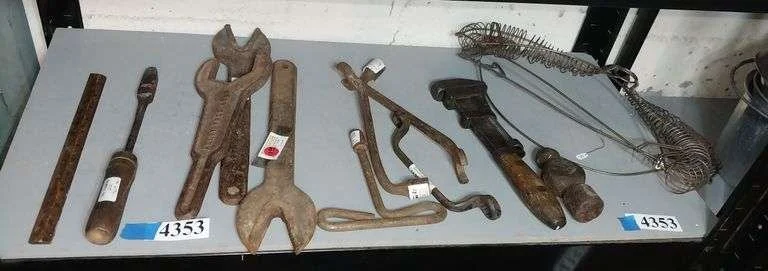 4353 Primitive wrenches, soldering iron, hammerhead, keen kutter monkey wrench, wire hangers, etc