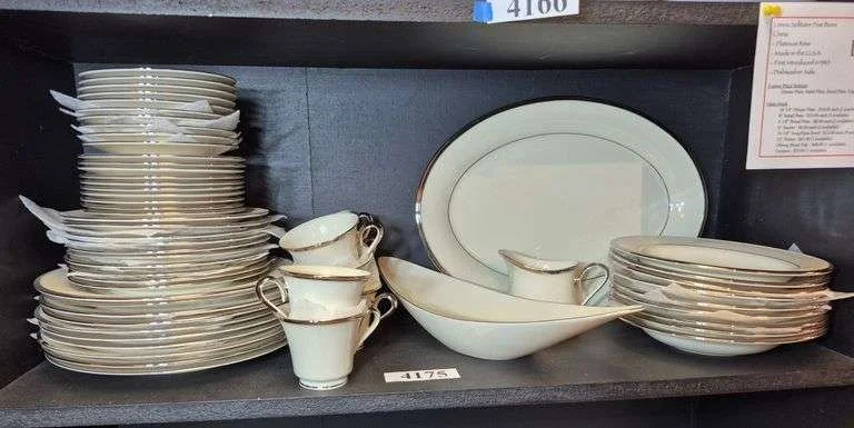 4334 Black and white McNichol China plates bowls cups and saucers, 6 Syracuse China dessert plates, Shenango plates and cups, Oxford dessert plates, blue and white bulls and cup, Stangl teapot lid