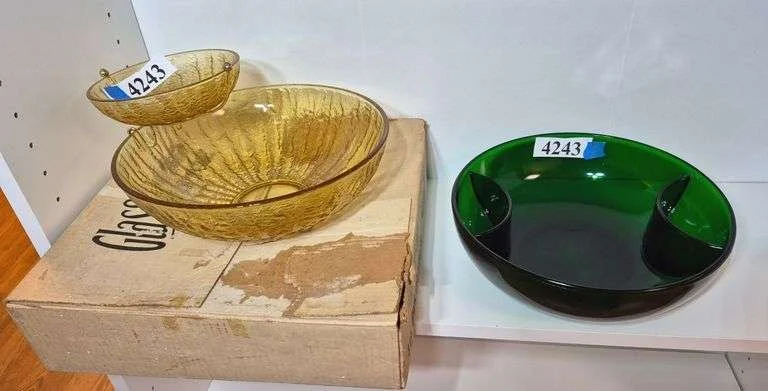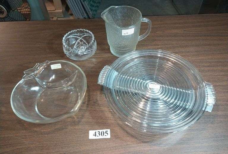 4305 Indiana glass pitcher, etched glass Crystal bowl, divided fruit shaped bowl?, mid-century Manhattan serving platter looks these up