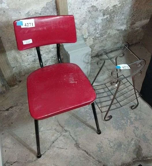 4271 Mid-century red vinyl chair, wrought iron rack? Magazine? Smoking?