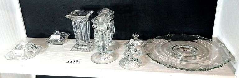 4299 Gorham glass vase, pair of candlesticks with prisms, Federal Glass butter dish, footed platter, covered dish, lids