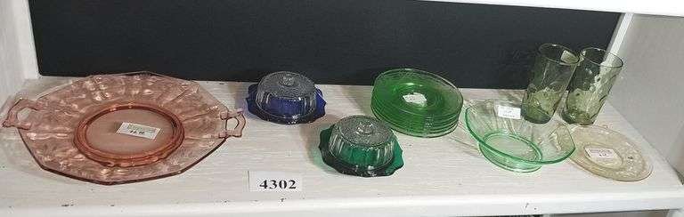 4302 Pink glass handled platter, yellow saucer, green saucers, bowl, glasses, and covered dish under plate, Blue covered dish under plate