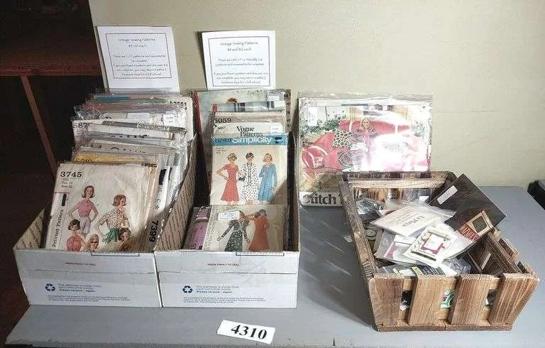 4310 Vintage sewing patterns, stitch n stuff sofa pattern, buttons, single earrings, travel sewing kits